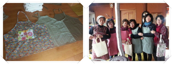 ▲ 문경수련원으로 보낸 앞치마 & 우리가 만든 에코가방. 왼쪽 끝 윤성희 보살님, 오른쪽 끝 이윤선 총무님~^^