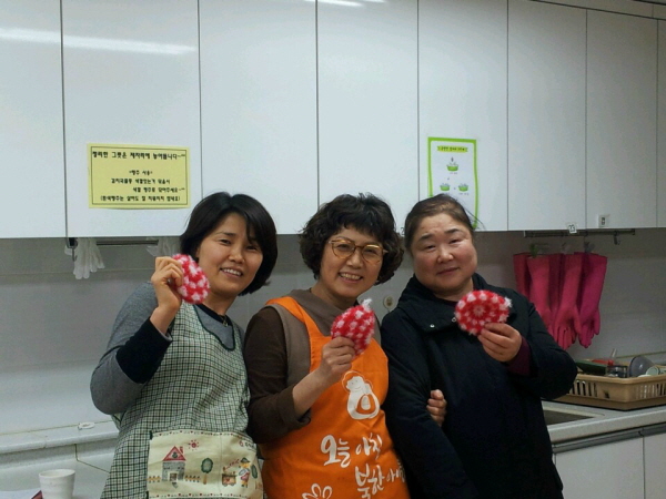 ▲ 김영식 보살님이 직접 만든 친환경 수세미를 들고 함께 애써주는 보살님들과 찰칵!!