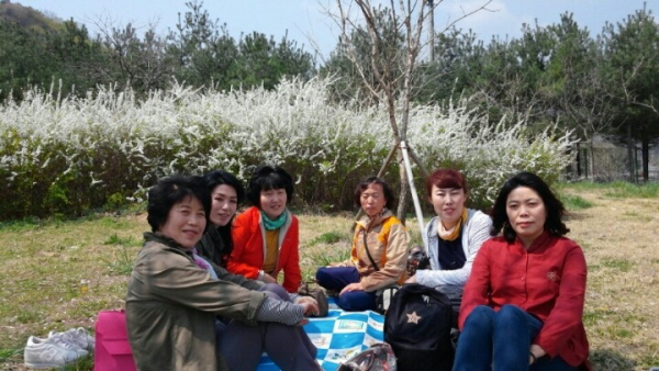 ▲ 정회원교육 가는 길에 칠곡휴게소에서 점심공양 하며~ 화사하게 핀 조팝나무가 멋진 배경이 되어주었습니다~^^