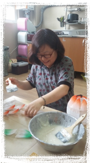 ▲ 연꽃잎에 열심히 풀칠을 하고 있는 연등 위원장 공시연 보살님~ㅎㅎㅎ