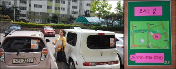 ▲ 주차 중에도 홍보효과가 만점인 익산 불교대생 차량들과 손글씨로 정성껏 만든 안내표지판~~