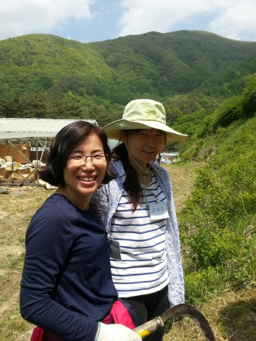 ▲ 봄불교대학 특강수련 울력시간. 낫을 들고 활짝 웃고 있는 이순덕 보살님~^^
