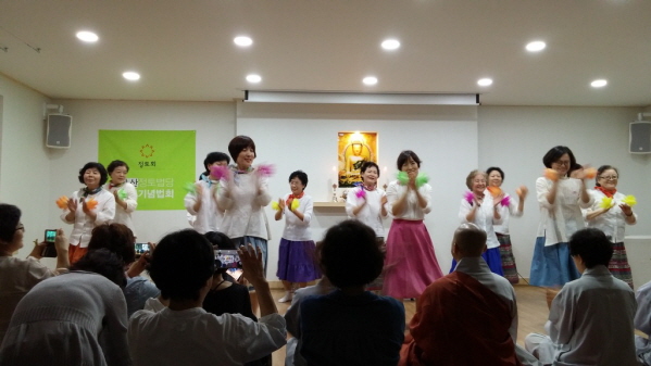 이어진 하이라이트 행사! 대구정토회 연화회 보살님들과 모둠장들의 아름다운 축하공연. 연화회는 만 60세 이상 정회원 보살님들로 구성되었는데, 춤이 아무리 헷갈려도, 무릎이 아파도 연습하고 또 연습하면서 열정은 젊은 보살들 못지않았고, 눈망울은 명문대생들이 울고 갈 정도로 초롱초롱하였습니다. 시어머님 차상옥 보살님과 며느리 박향숙 보살님이 한 무대에 오른 것도 이색적이었습니다. 정토예술공연단을 결성해도 될 만큼 열정적이고 아름다운 무대였습니다.