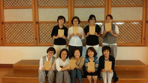 ▲ 환경수행일지로 하루의 환경실천을 되돌아보는 시간을 갖는 봄경전반 도반들~뒷줄 왼쪽에서 두 번째가 김화자 보살님~^^