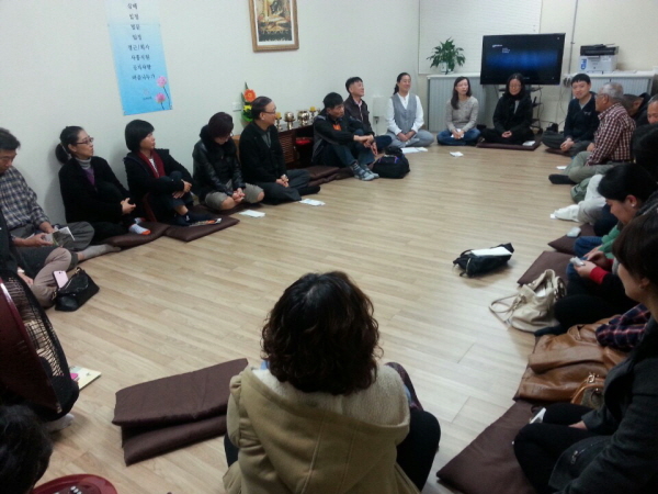 시드니의 비비드 (Vivid Light Show) 축제가 한창이던 지난 6월 6일 저녁, 시드니정토회에서는 기획법회가 열렸습니다. 여왕님의 생신인 6월 8일 월요일이 공휴일인지라 직장인들에게는 더욱 황금 같은 연휴가 시작되는 토요일 저녁, 함께 여행을 계획했던 친구를 데리고 약간은 서운한 마음으로 법당에 갔습니다. 이 와중에 과연 사람들이 얼마나 올까 하는 의구심을 지니고 법당에 들어서는 순간, 완전한 기우였음을 알 수 있었습니다. 공간이 좁아서 미리 파악한 인원수에 맞게 자리를 마련하기 위해 반으로 접어 빼곡히 놓은 방석 수만큼 가득 찬 사람들! 시드니는 지금 쌀쌀한 겨울이지만 법당 안은 온기가 가득했습니다.