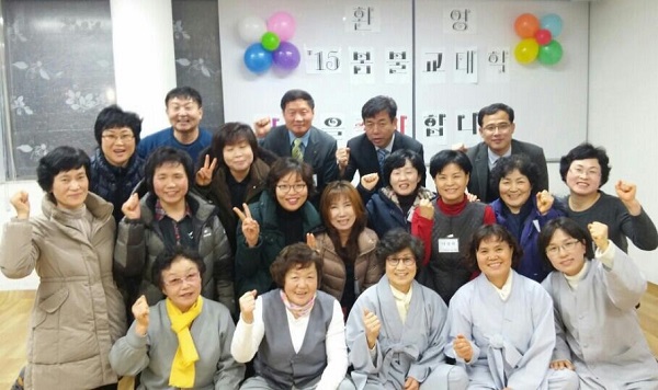 ▲ 봄 불교대학 입학식 신입도반들과 파이팅! (앞줄 오른쪽 첫 번째 전순연 보살님)