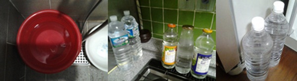 ▲ 햇볕 잘 드는 곳의 양동이, 그리고 가스레인지와 냉장고 옆의 병에 담겨 따뜻해지고 있는 물~~