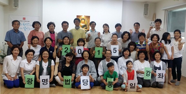 광명법당에서는 지난 6월 21일 북한 의사 출신 새터민 강사 송현영 님의 강연이 진행되었습니다. 메르스로 인해 정토회의 큰 행사들도 연기되는 유례없는 상황이었으나 꿋꿋하게 준비와 실무를 총괄한 사회활동팀원들의 노력으로 모두의 관심 속에서 강연을 시작하게 되었습니다. 매주 토요일 새벽 통일기도를 함께한 도반들이 수줍은 노래와 율동으로 한편의 멋진 동영상을 제작하였고, 통일담당의 적극적인 영상 홍보 덕분에 광명법당 도반들과 가족들, 그리고 인근 법당에서도 여러분들이 참석했습니다. 대법당에선 메르스도 얼씬하지 못할 정도로 도반들의 건강한 웃음소리가 끊이질 않았습니다. 강사는 점심 공양을 함께할 정도로 소탈했으며 알차게 진행된 2시간 30분의 강연은 통일의 열기로 가득 찼습니다. 행사 당일 각자 맡은 소임대로 가을불교대 학생들이 접수를, 경전반에서는 외부홍보를, 봄불교대학 새내기 학생들은 내부 안내를 하고 간식으로 시원한 수박을 준비했습니다. 서로 존중하고 배려하면서 강연을 준비하는 모습은 모자이크 붓다 그 자체였습니다.