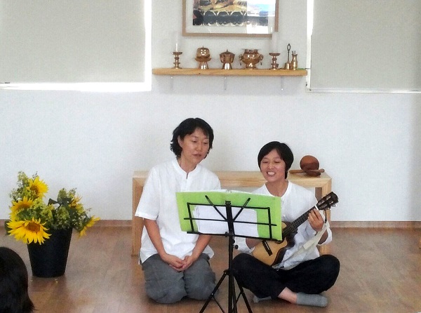 마음나누기가 끝난 다음, 담당한 권유정 보살님과 총무 김영주 보살님의 우쿠렐레를 곁들인 노래 공연을 했는데 가을불대 갈무리의 하이라이트였습니다. 또 가을불대 갈무리를 더욱 빛나게 해주었던 것은 봄불대생 갈현옥 법우님이 키운 해바라기 꽃 선물이었습니다. 불대생들 모두 해바라기 꽃처럼 환하게 웃으며 감동했습니다.