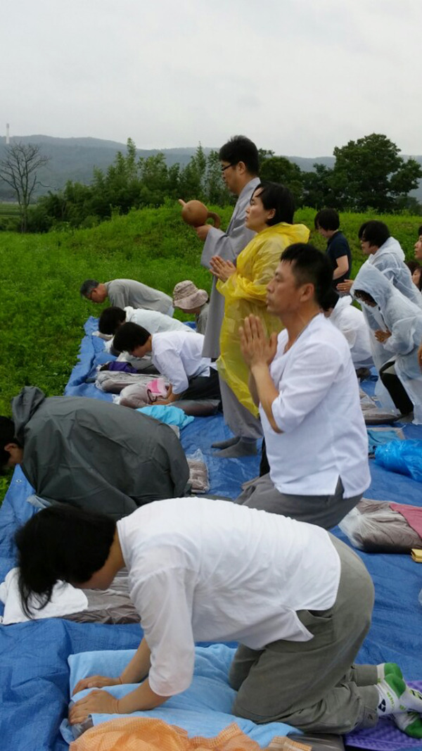 가랑비가 부슬부슬 내리는 가운데 속속 도착하는 도반들에게 준비해간 방석과 방석 덮을 비닐(이만영 거사님 준비)을 나누어 주며 자리 정돈을 하였습니다. 주춤주춤 망설이던 불대생들은 빗속에서 하나 둘 정진 대열을 갖추기 시작했습니다. 기도를 하는 동안 계속 내린 비는 때때로 굵은 소낙비로 변하기도 했습니다. 비옷을 입고 절을 하다 보니 더워져서 비옷을 벗었다가 옷이 젖어 다시 비옷을 입기를 반복했습니다.