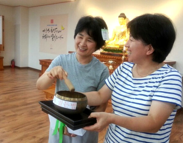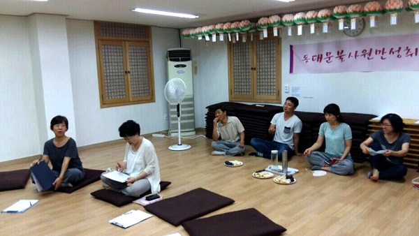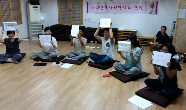 7월 17일 금요일 해운대법당에서 열린 <도전 골든벨>에는 15명의 선수가 참가했습니다. 박미영 보살이 칠판과 매직펜을 준비해온 덕에 실제 TV 프로그램처럼 열띤 퀴즈쇼가 시작되었습니다. 모두 일심동체로 칠판을 들고있는 모습에서, 마음은 이미 통일이 이루어진 것만 같았습니다.