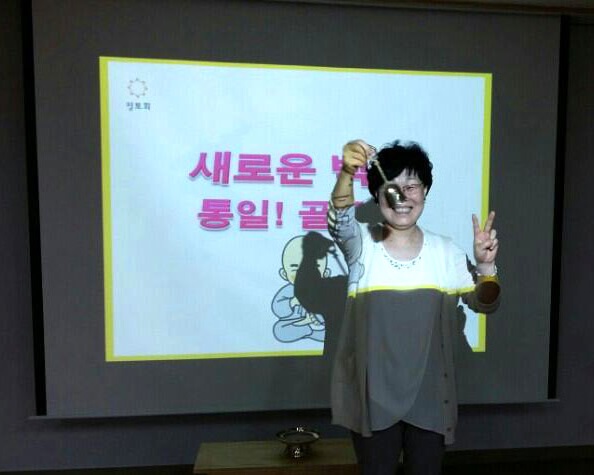 ▲ 통일에 대해 이렇게 재미있는 시간을 도반들과 함께 가질 수 있어 행복할 따름입니다. 끝까지 문제를 푼 최종 승리자, 원미해 보살입니다.