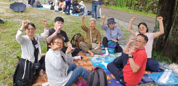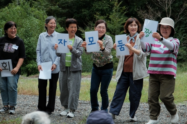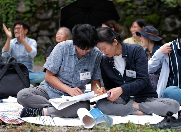 적막을 깨는 첫 순서는 모둠별 구호 자랑입니다. 버스에서는 자기를 소개했지만, 이번에는 자기 모둠을 소개합니다. 전주지회에는 7개 모둠이 있습니다. 온라인으로 다른 모둠의 회원들을 봐 왔지만 이렇게 직접 눈앞에 있으니 그 존재가 생생하고 뚜렷합니다.