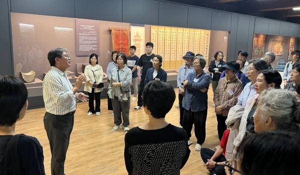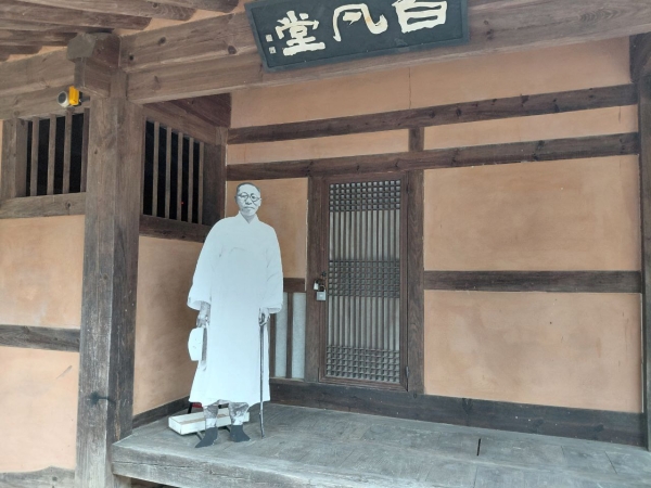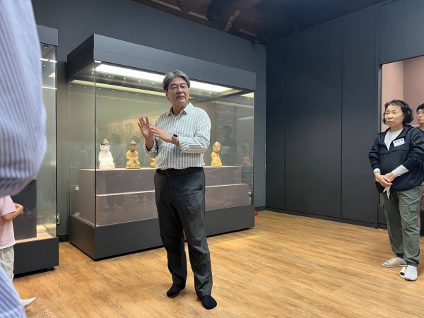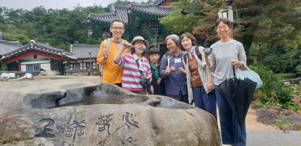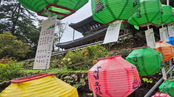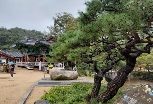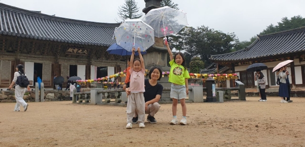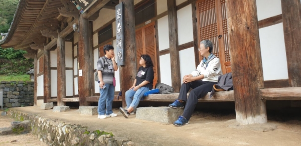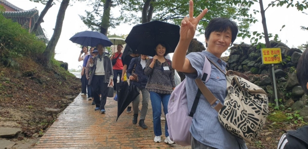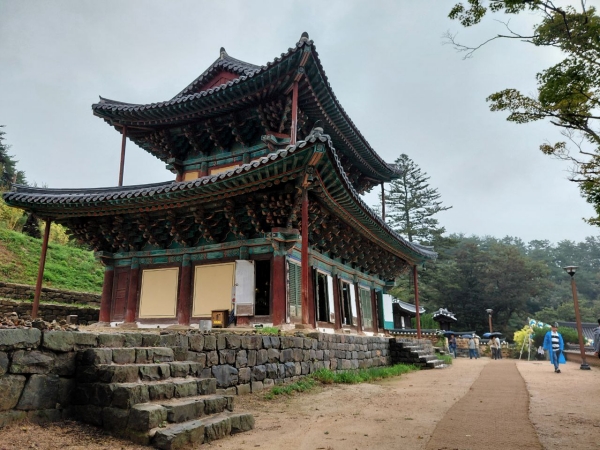 비가 그치지 않아 고찰의 은은한 나무 냄새가 회원들을 감쌉니다.