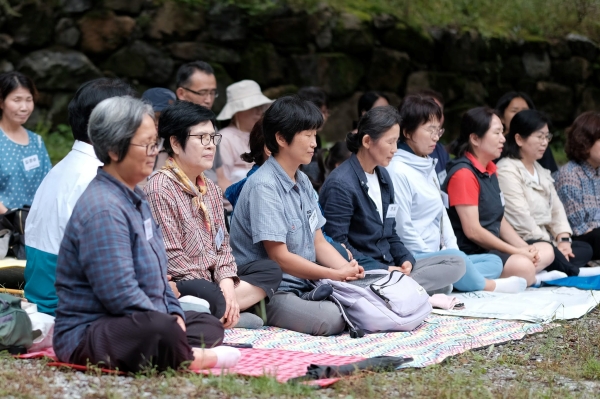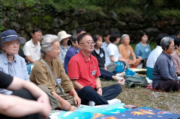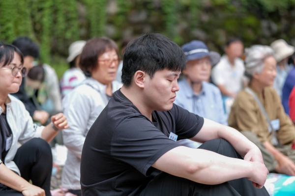 입정하는 회원들의 머리 위로, 보슬보슬 비가 내립니다. 눈을 감으니 이 고요한 숲에 아무도 없는 것만 같습니다.