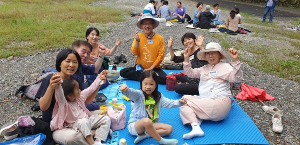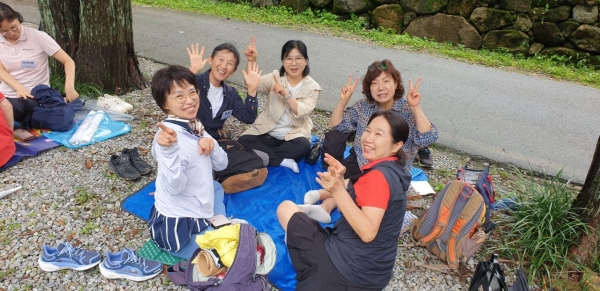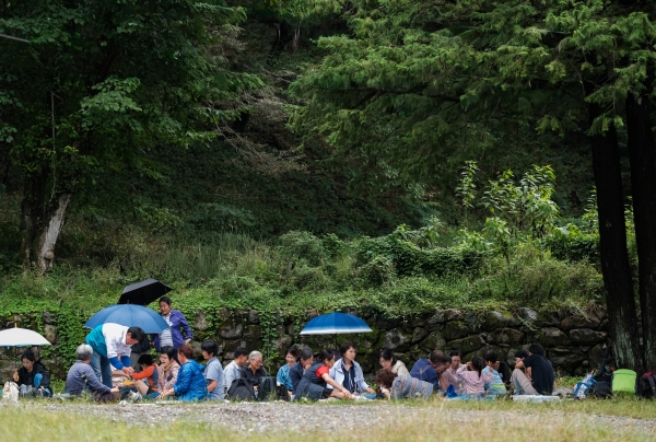 식사 장소는 사찰 주차장 뒤편의 공터입니다. 주변에 공사 자재도 보이고 몇몇 모기와 풀벌레도 함께 있지만, 막상 돗자리를 깔고 앉아 고개를 드니 보이는 것은 나를 둘러싼 회원들뿐입니다.