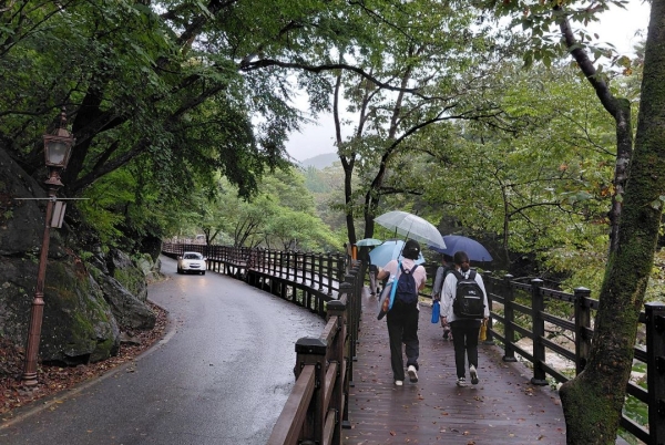 버스 주차장에서 마곡사까지 천천히 걸으면 25분 정도 걸립니다. 계곡을 따라 놓인 데크를 걸으며 이야기를 나눕니다. 비가 슬슬 내려 생각보다 물이 많습니다.