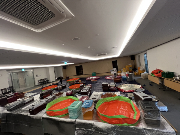 한쪽에서는 9시에 도착할 봉사자를 위해 돗자리와 양념 통을 준비합니다. 7시에 온 봉사자들은 간단한 간식을 먹으며 잠시 숨을 돌립니다. 한 봉사자가 3일간의 일정을 정리해서 말해주었습니다.