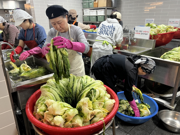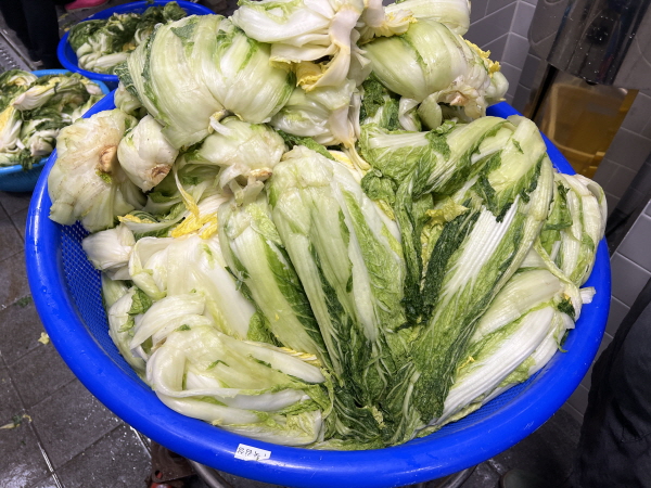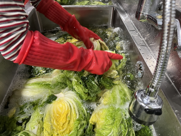 “어제 저녁에 절여 놓은 배추의 소금기를 씻어내고 있어요. 3단계로 깨끗하게 씻은 뒤, 배추 물기를 쫙 빼고 양념 속을 넣을 예정이에요”