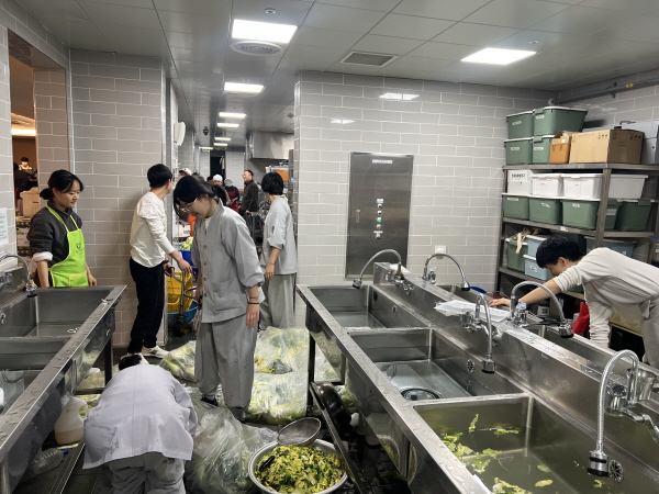공양간에서는 배추를 씻다가 떨어지는 잎도 버리지 않습니다. 깨끗이 손질해 우거지나 겉절이, 볶음 재료로 다시 사용하기 때문입니다. 봉사자들은 배춧잎 사이에 낀 낙엽이나 더러운 이물질을 하나하나 제거하며 정성스럽게 손질합니다.