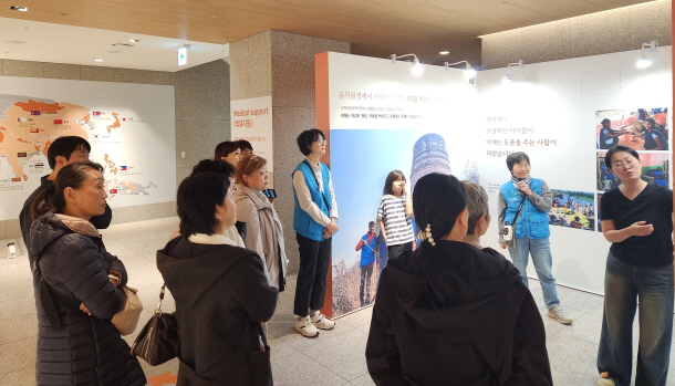 때마침 JTS 32주년 사진전이 열리고 있어, 회관둘러보기 팀은 JTS 활동에 대한 향자재법사님의 설명을 들을 수 있었습니다. 주승용 님의 고려인 아내가 통역을 해주었습니다.