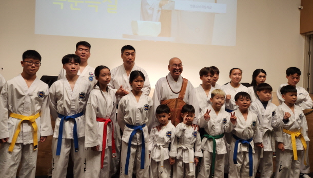 행사가 시작되고 JTS안산다문화센터 태권도 교실 학생들의 공연 후 태권도 시범단과 법륜스님이 기념촬영을 하였습니다.