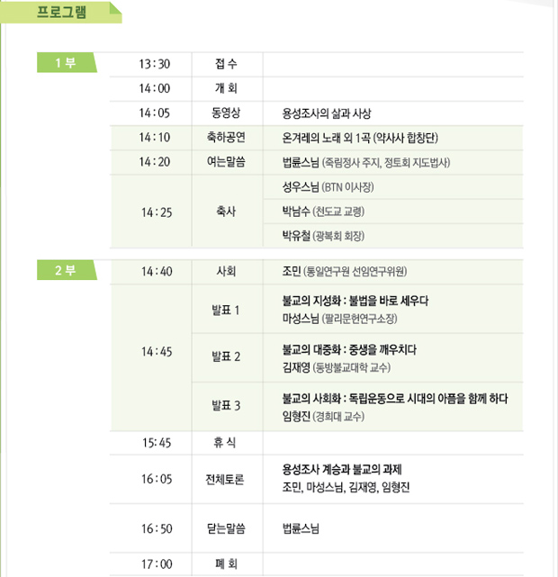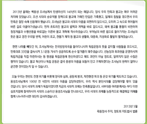 * 일시: 6월4일(화) 오후 2시 * 장소: 천도교 증앙대교당 (안국역 5번출구)* 주최: (사)독립운동가 백용성조사 기념사업회, 백용성조사 유훈 실현후원회, 백용성조사 탄생성지 죽림정사 * 주관: 정토회* 후원: 대한불교조계종 총무원, BTN, BBS, 법보신문, 광복회 * 문의:070-4015-8513* 찾아오시는 길