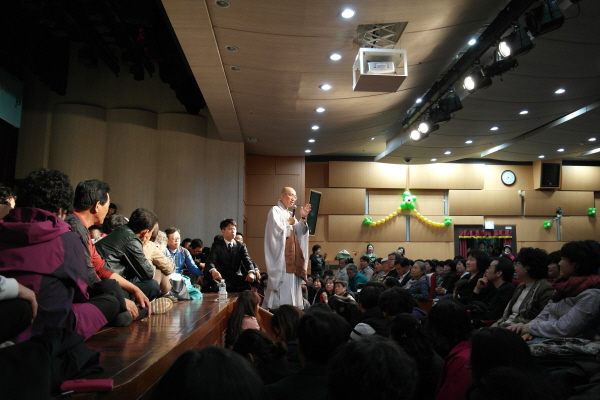 스님께서 강연장에 들어서자 참석자들은 환호를 하였습니다. 좁은 장소에 많은 사람들이 와서 그 열기는 더한 것 같았습니다. 무대위 스님 설 자리까지 가득 메우고 스님께서는 계단에서 강연하셨습니다.