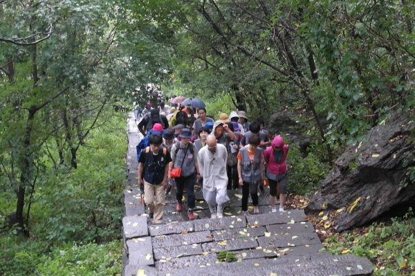 어제 모든 일정을 마무리 하고 12시가 넘어 잠자리에 들었지만, 다행히 오늘은 아침 일정이 조금 여유가 있었습니다. 보통 3시 전후로 기상하여 이동하는데, 오늘 아침은 5시 50분에 기상하였습니다. 기상 후 짐을 챙겨 현관으로 오니 비가 쏟아지고 있었습니다. 아침을 먹고 나서도 비가 내리고 있어서 오녀산성에 오르는 것이 가능한지 확인하는 동안 스님께서 고구려 시대의 홀본, 집안지역에 대해서 설명을 해주셨습니다. 고구려가 처음 세워질 때 소서노와 주몽의 이야기, 유리왕이 왕위 오르면서 소서노가 비류와 온조를 데리고 백제를 건설한 이야기, 유리왕때 왕권을 강화하기 위해 집안으로 수도를 옮긴 이야기등을 듣고 있는 가운데 비가 그치면서 오녀산성에 오르는 것이 허락되어서 다들 가벼운 마음으로 오녀산성으로 향했습니다.