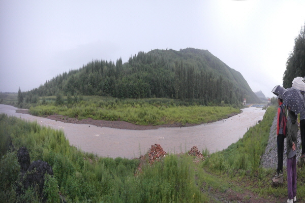 천지를 보지 못한 일부 사람들이 있어서 좀 더 기다리는 동안 천지를 가둔 구름이 비를 뿜기 시작했습니다. 이에 우리들도 더 이상 기다릴 수 없어서 장백폭포로 이동했습니다. 이제는 비가 아예 퍼붇기 시작했습니다. 가지고 간 우비나 우산이 별 소용이 없었습니다.