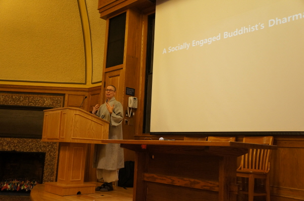 스님께서는 먼저 “먼저 이곳에는 처음 방문했는데 초청해 준 선준 스님께 감사드립니다. 학교가 예쁘네요. 먼저 오늘 강연은 주제가 따로 없으니 불교, 환경, 평화, 차별문제, 그리고 우주와 과학, 어떤 주제에 대해 질문을 해도 좋습니다. 이런 것들은 벌려놓으면 많은 것 같고 다른 것 같지만, 모아보면 다 우리 삶의 문제입니다.” 라고 말씀하시면서 질문을 받았습니다.