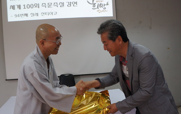 ▲ 그리고 현재 칠레 한인회에서 한인회관 건물 마련을 위해서 모금운동이 진행 중이라는 소식을 듣고서 오늘 강연 후에 모인 보시금 500불을 김지용 한인회장님께 전액 전달하셨습니다.