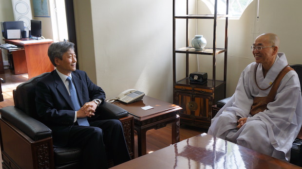 스님께서는 칠레 대사관 관저에서 1시간 정도 환담을 나누시면서 중남미 지역을 방문한 소감 등을 말씀하시기도 하고, 또 자연스레 우리민족의 비젼과 통일에 대해서도 얘기를 나누셨습니다. 특히 대사관의 여성 서기관님은 “불자이면서 스님의 팬”이라고 하시면서 칠레 대사관을 대표하여 칠레산 허브차 등을 준비했다고 하시면서 작은 선물을 주었습니다. 스님께서도 감사의 마음을 담아 유지은 대사님께는 사인한 새로운 백년 책을 홍석화 공사님께는 인생수업 책을 선물했습니다. 대사관에서는 스님의 책을 서로 돌려보시겠다고 하면서 다들 좋아 하셨습니다.