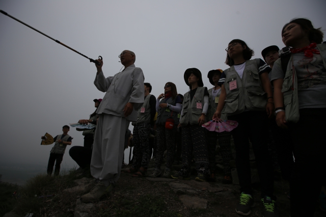 스님은 청년 130여명을 이끌고 맨 앞에 서서 백암산성의 남문에서 시작해 웅장하게 쌓여진 서쪽 성벽 위를 걷기 시작했습니다. 성벽을 오르느라 송수신기를 통해 들려오는 가쁜 숨소리 사이로 스님은 백암산성의 구석 구석을 자세히 설명해 주었습니다.