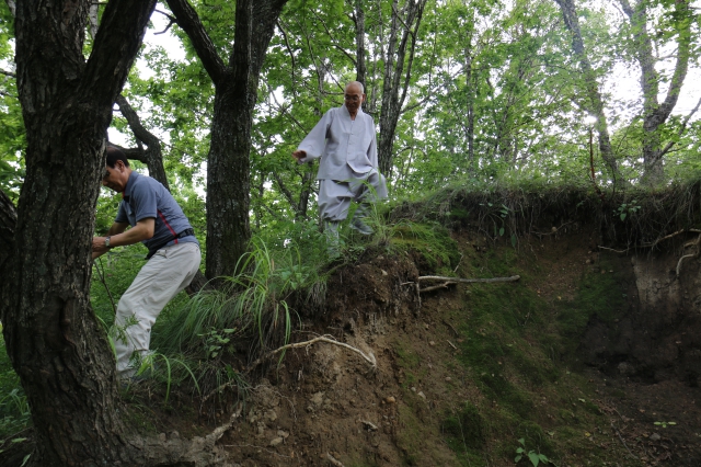 처음에는 나무가 울창해서 이곳이 성터인가 싶었는데 스님은 이곳을 보자마자 “여기가 바로 성벽이네” 하며 기쁜 표정을 지었습니다.