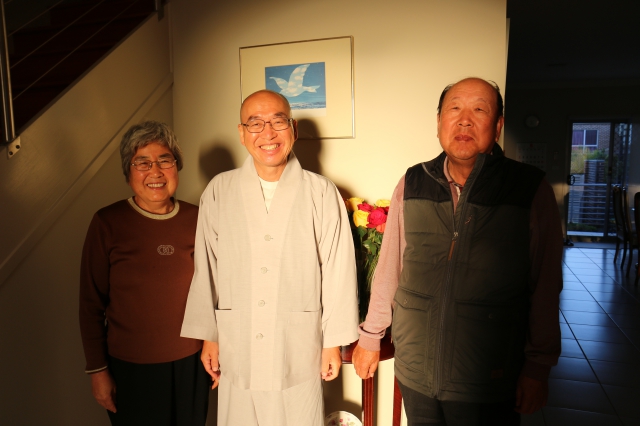 ▲ 이번 시드니 일정을 총괄한 시드니정토회 정은지 총무님(스님 오른쪽)과 운전 봉사를 해준 구본상 거사님(스님 왼쪽)