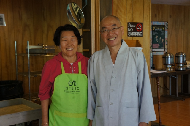 식당으로 가니 이번에 공양팀의 팀장을 맡은 뉴욕정토회 차효순 대표님이 스님에게 반갑게 인사를 하였습니다. 차효순 대표님은 연세가 70세가 넘어 명상수련에 참가하는 대신에 공양팀의 팀장을 맡아 묘덕 법사님, 무변심 법사님, 최말순 보살님, 김명호 거사님과 함께 이번 명상수련 및 행자대회의 공양 바라지를 하시기로 하였습니다. 스님은 “고생이 많다”고 격려하였습니다.
