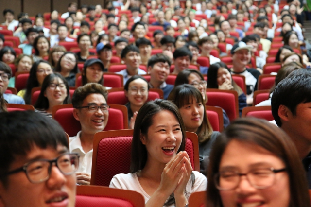 밖에 나가서도 이런 관점만 분명히 갖는다면 문제가 없어요. 너무 결과 지향적으로만 가지 않고 항상 ‘지금, 여기’ 이 순간의 소중함을 알고 사는 청년들, 그런 기쁨을 갖는 청년들이 되면 좋겠습니다.” (청중 박수)