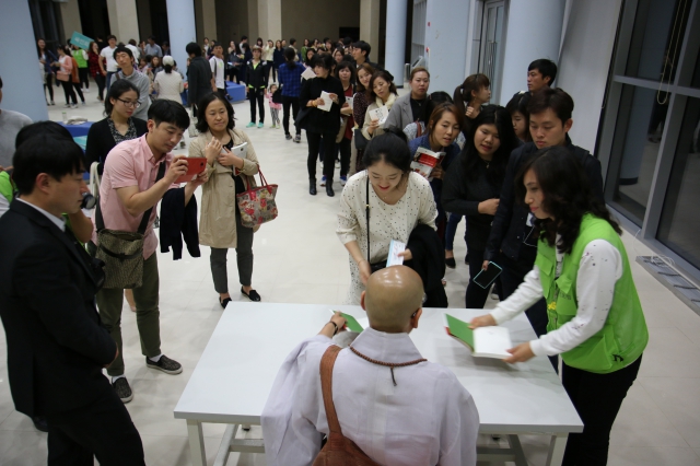 강연장 입구 로비에서는 스님의 책 사인회가 열렸습니다. 청년들은 긴 줄을 서서 자신의 차례를 기다렸습니다. “스님, 건강하세요” 라고 인사하자 스님도 환한 웃음으로 “고마워요”라고 대답했습니다.