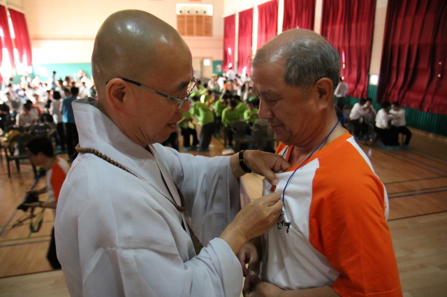 ▲ 조성식 대표에게 뱃지를 달아주고 있는 스님