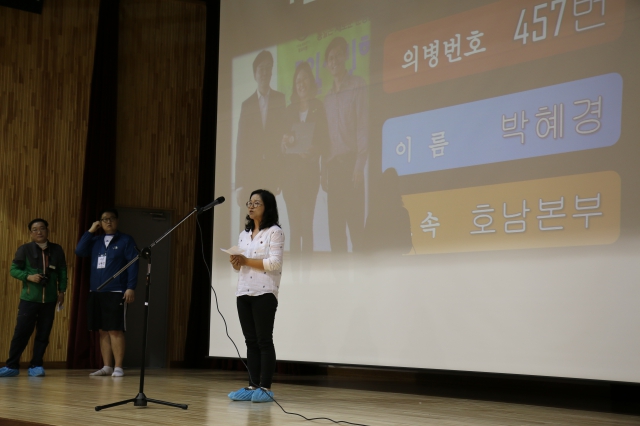 이어서 통일의병이 된 한 명 한 명의 얼굴과 목소리, 마음을 만나는 시간을 가졌습니다. 오늘 참석한 230여명의 통일의병들이 ‘내가 통일의병이 된 이유’와 ‘통일의병이 되면 무엇을 하겠다’는 2가지 주제로 20초 동안 발표하는 ‘20초 스피치’ 시간이었습니다.