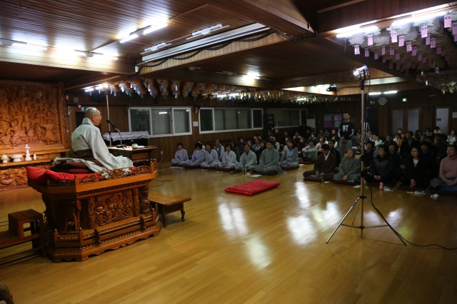 복을 비는 기도는 ‘부인이 남편 대신 가서 복을 빌어주고 남편이 복락을 받으면 된다’ 이런 생각을 할 수도 있지만, 정토회에서는 복을 비는 기도를 안 하기 때문에 누가 대신해 줄 수가 없습니다. 자기 기도는 자기가 해야 됩니다. 주간반은 해야 되고, 저녁반은 안 해도 되고, 이런 게 아닙니다. 여러분들 모두 기도에 입재해서 절에 못 나오면 집에서 하든지 해서라도 정초기도를 꼭 하시기 바랍니다.”