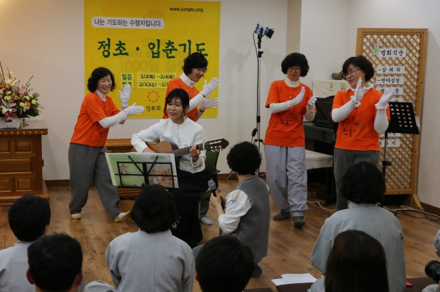 오늘 같은 날 축하공연이 빠질수 없죠. 예사롭지 않은 포스를 풍기는 창원법당의 보살님 다섯 분이 '행복을 주는 사람' 노래를 기타 반주와 함께 차분하고 앙증맞은 율동으로 풀어내 뜨거운 박수를 받았습니다. 아직도 귀속에는 메아리가 울리는 것 같습니다. “내가 가는 길이 험하고 멀지라도 ♬ 그대 함께 간다면 좋겠네”.