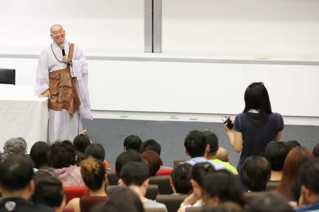소개 영상에 이어서 스님이 무대에 오르자 교민들은 우레와 같은 박수와 함성으로 스님을 반겼습니다. 스님은 개신교를 믿는 사람들이 많은 교민 사회의 여건을 헤아리며 오전에 교회는 잘 다녀왔는지 물어보며 강연을 시작했습니다.