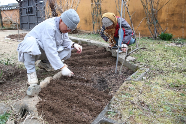 씨뿌리기까지 다 마치고 나니 날이 어두워졌습니다. 스님은 해가 다 질 때까지 마당 곳곳에 뿌리를 내리고 있는 잡초를 뽑았습니다. 잠시도 쉬지 않고 끊임없이 일을 찾아 하고 있는 스님의 모습을 보니 ‘정말로 농사일을 좋아하시는구나’ 하고 느낄 수 있었습니다.