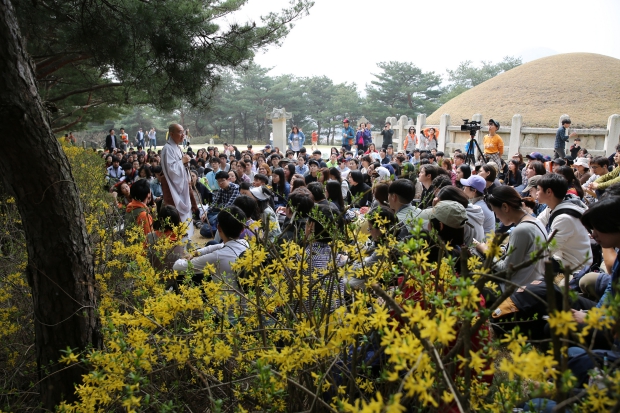 아침 9시 30분, 태종무열왕릉 앞에 모인 380여 명의 청년대학생들은 스님이 걸어나오며 송수신기로 인사를 건내자 우레와 같은 박수로 환영을 했습니다.