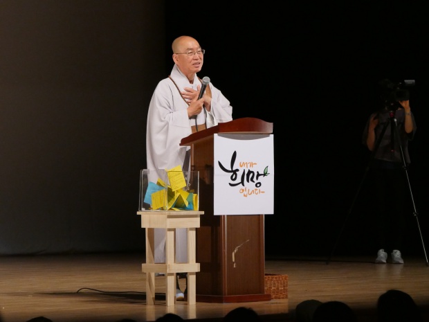 1,2층 강연장을 가득 메운 1000여 명의 청중들은 스님이 나오자 모두 환한 표정과 큰 박수로 환호했습니다. 스님은 강연을 시작하기에 앞서 즉문즉설에 어떻게 참여하면 되는지 간단히 설명을 해주었습니다.