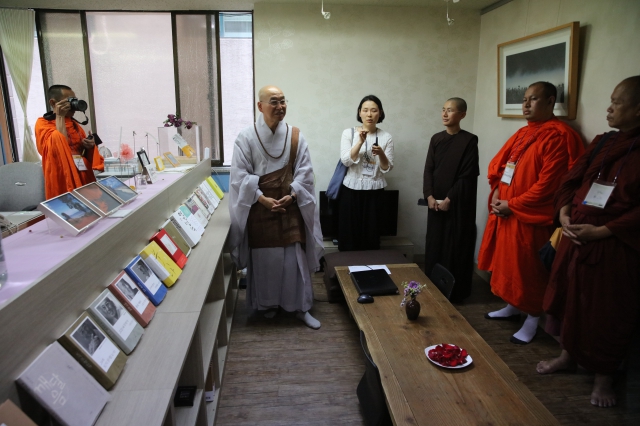 다시 버스를 타고 전국비구니회관으로 향했습니다. 동남아에는 비구니제도가 없기 때문에 INEB 동남아 스님들은 한국의 활성화된 비구니제도에 대해 매우 관심이 높았습니다. 전국비구니회관은 서울 강남구 수서동에 지하 2층 지상 3층으로 건립되어 전국 각지 17개 지회 7천여 명의 비구니 스님들의 역량을 결집하는 역할을 하는 곳입니다.