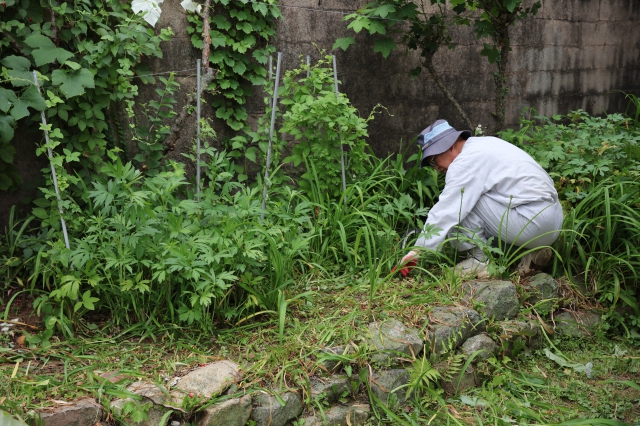 이어서 스님은 화단에 들어가 장미 나무 가지치기를 했습니다. 장미가 워낙 무성하게 자라나고 있어서 옆에 있는 수국과 다른 꽃들이 기를 펴지 못하고 있는 모양새였습니다. 지난 주에 장미의 줄기 일부가 담벼락 바깥으로 넘어갈 수 있게 작업을 해두었는데, 오늘은 가지 치기를 더 하고 지지대가 되어 줄 수 있는 줄을 더 만들어 주었습니다.