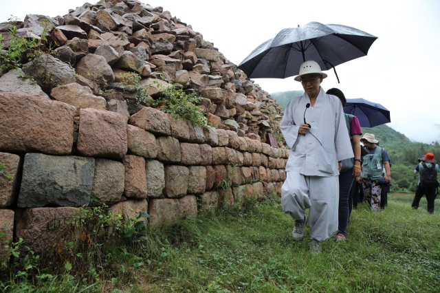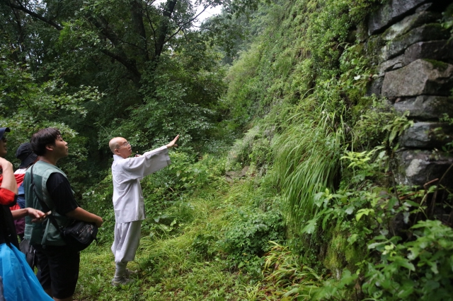 스님은 성벽을 가리키며 고구려인들의 축성법에 대해 자세히 설명했습니다.